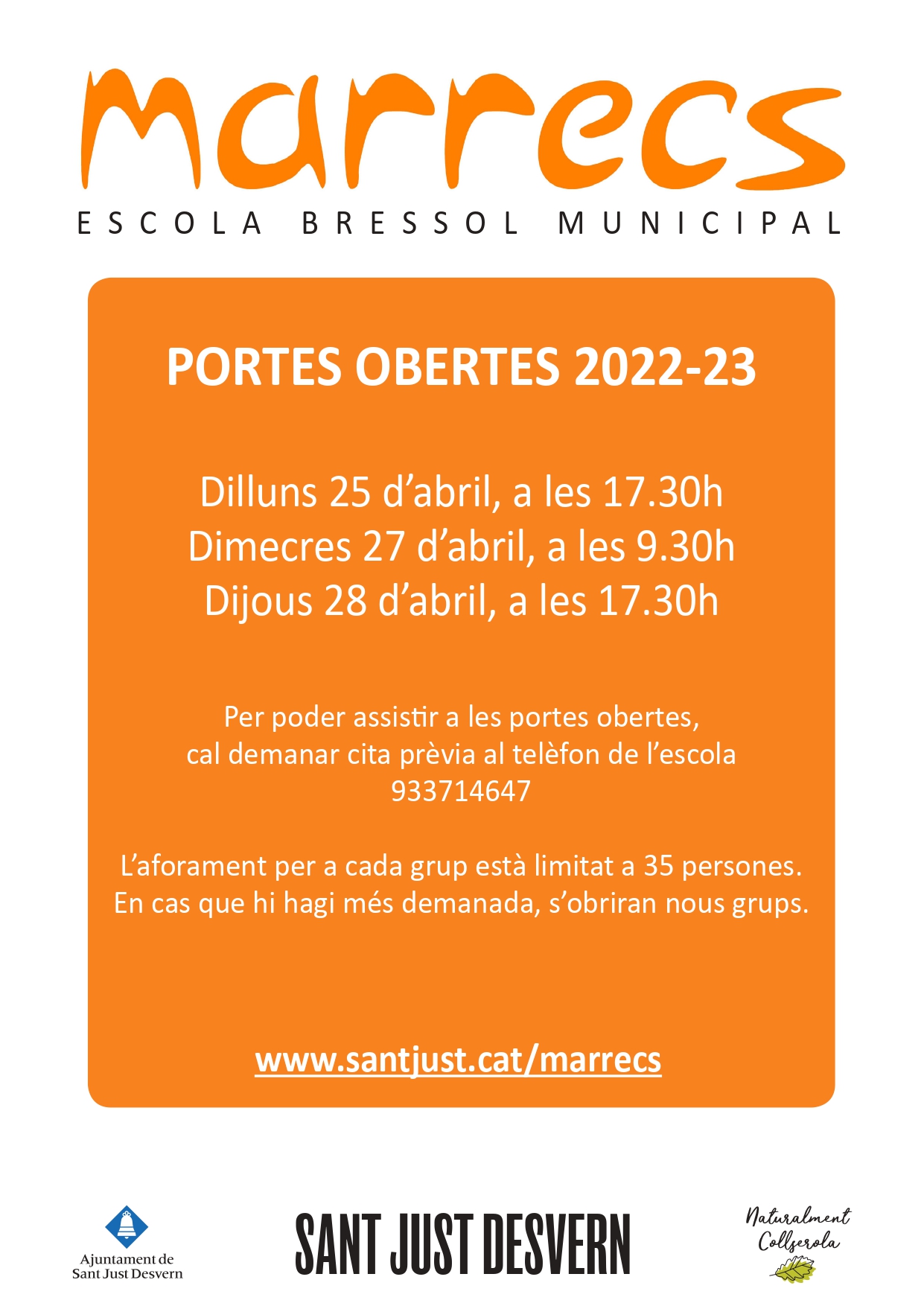 L’Escola Bressol Municipal Marrecs obre les portes a les famílies interessades en inscriure els seus fills al centre el curs 2022-2023. Les sessions es faran el avui, 25 d’abril, a les 17.30 h, el dimecres 27 d’abril, a les 9.30 h, i el dijous 28 d’abril, a les 17.30 h. L’aforament de cada jornada està limitat a 35 persones. Per assistir-hi, cal que demaneu cita prèvia al telèfon de l’escola: 93 371 46 47.