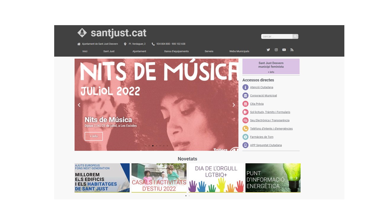 S’ha actualitzat el web santjust.cat per oferir un portal web més àgil, intuïtiu, dinàmic, modern i atractiu. El nou disseny és responsive (és a dir, accessible i adaptable per a tots els dispositius, ja siguin telèfons mòbils, tauletes o ordinadors).
