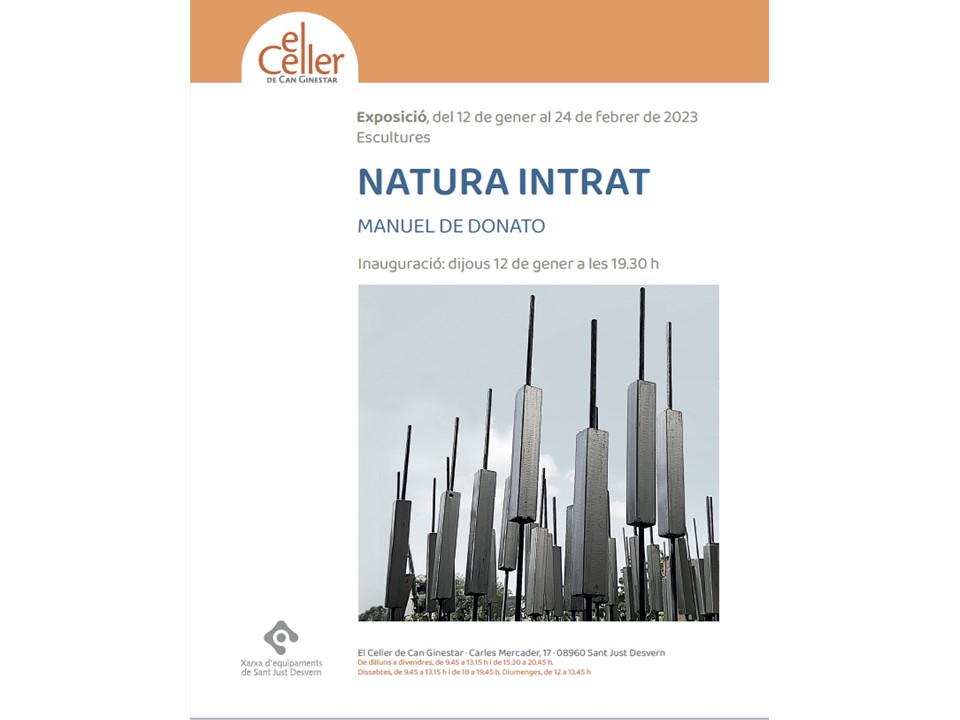 El dijous 12 de gener s’inaugura la primera exposició de 2023 a la sala El Celler de Can Ginestar. L’artista Manuel de Donato mostra diferents escultures en ferro. “Natura intrat” comença amb un petit bosc de joncs que relaciona la idea de la vegetació com a ornament modernista i introdueix la natura. El plantejament de la mostra es simètric, des del petit bosc de joncs, tant a la sala dreta com a l’esquerra, presenta dues peces de ferro molt geomètriques.