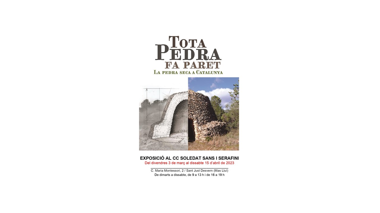 Divendres 3 de març, a les 18 h, al Centre Cívic Soledat Sans de Mas Lluí, s’inaugura l’exposició “Tota pedra fa paret – La pedra seca a Catalunya”. La mostra està produïda des del Departament de Cultura de la Generalitat de Catalunya, i hi col·labora el Centre d’Estudis Santjustencs.