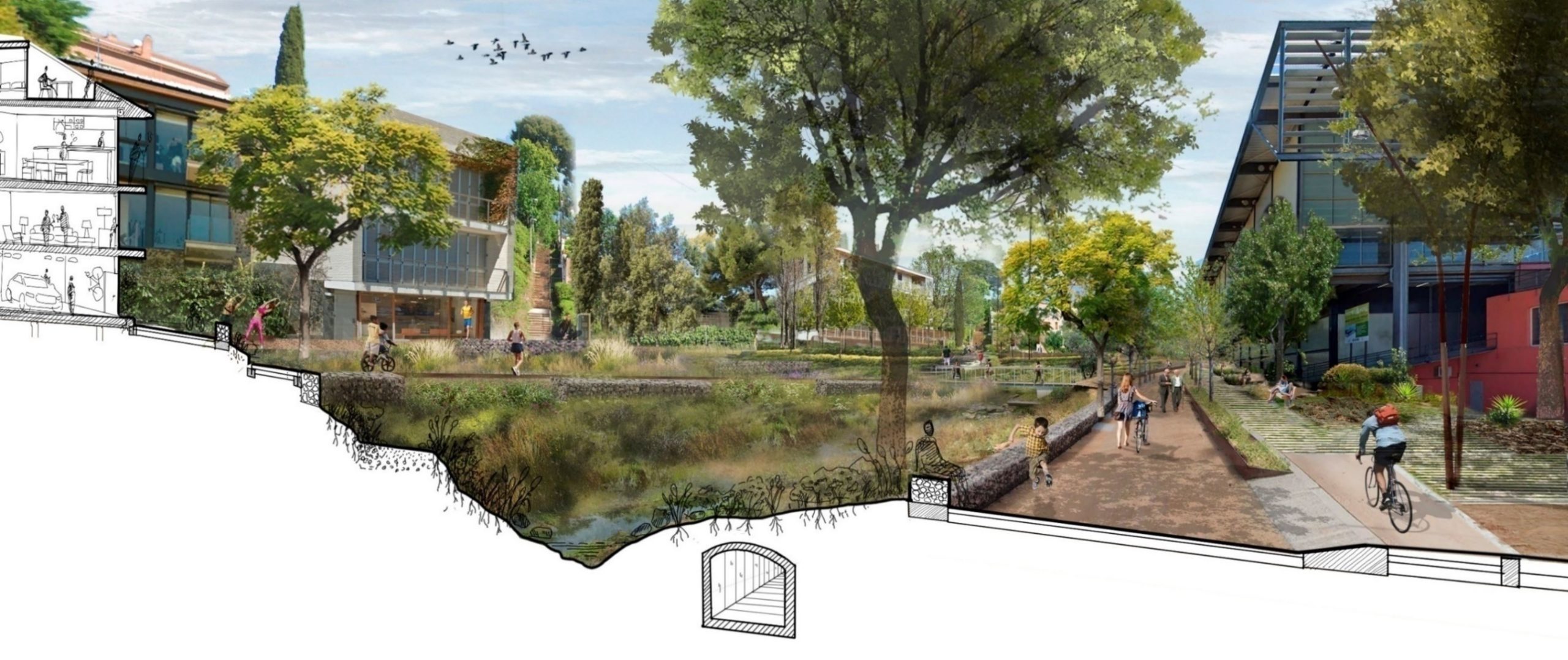 - Renaturalitzar l’espai recuperant la riera, el seu traçat i la seva vinculació amb la natura que l’envolta.