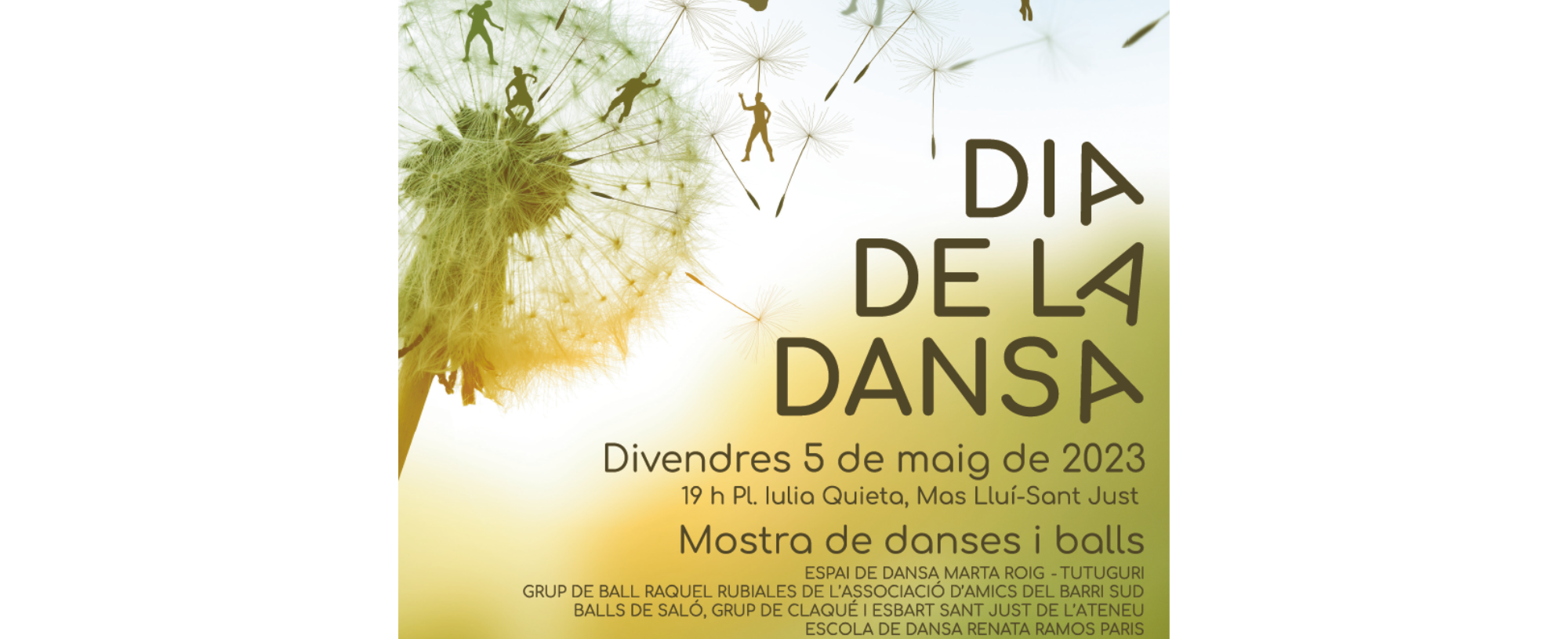 La mostra de danses i balls començarà a les 19 h, i hi participaran l’Espai de Dansa Marta Roig, el Tutuguri, l’escola de dansa Renata Ramos Paris, el Grup de Ball Raquel Rubiales de l’Associació d’Amics del Barri Sud Balls de Saló i el Grup de Claqué i Esbart Sant Just de l’Ateneu.