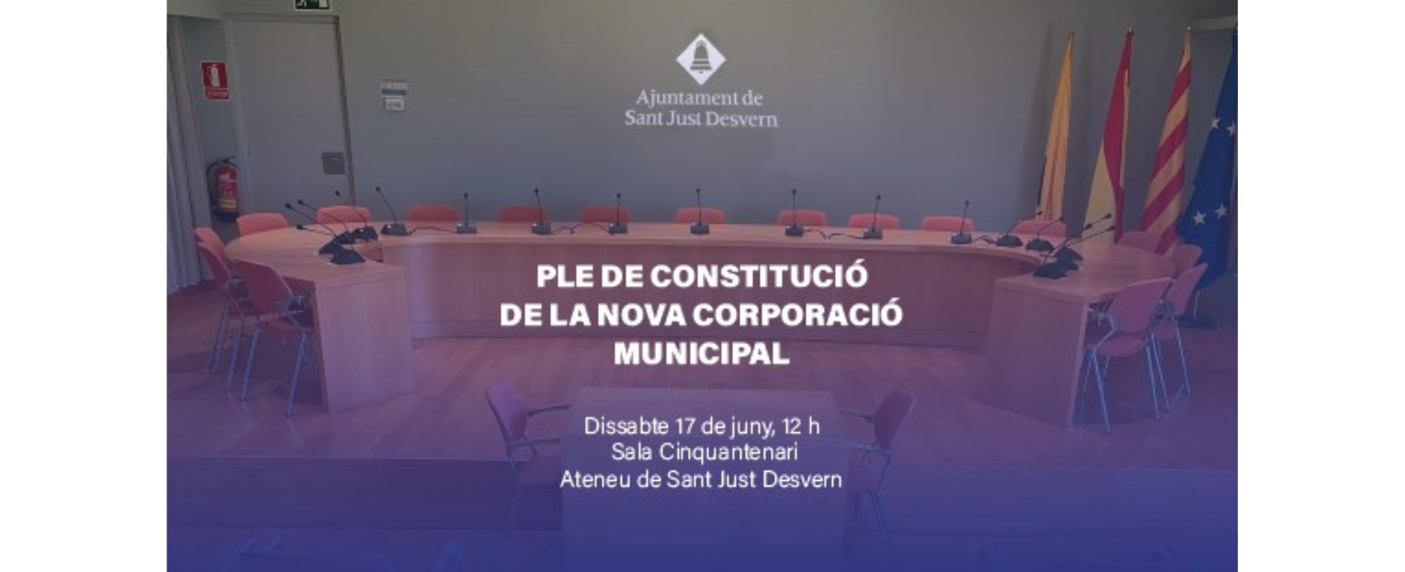 Dissabte 17 de juny se celebra el Ple de Constitució de la nova corporació municipal. Serà a les 12 h, a la Sala Cinquantenari de l’Ateneu de Sant Just Desvern. Es podrà seguir presencialment o en línia a través del canal de YouTube de l’Ajuntament. En acabat, hi haurà un refrigeri.