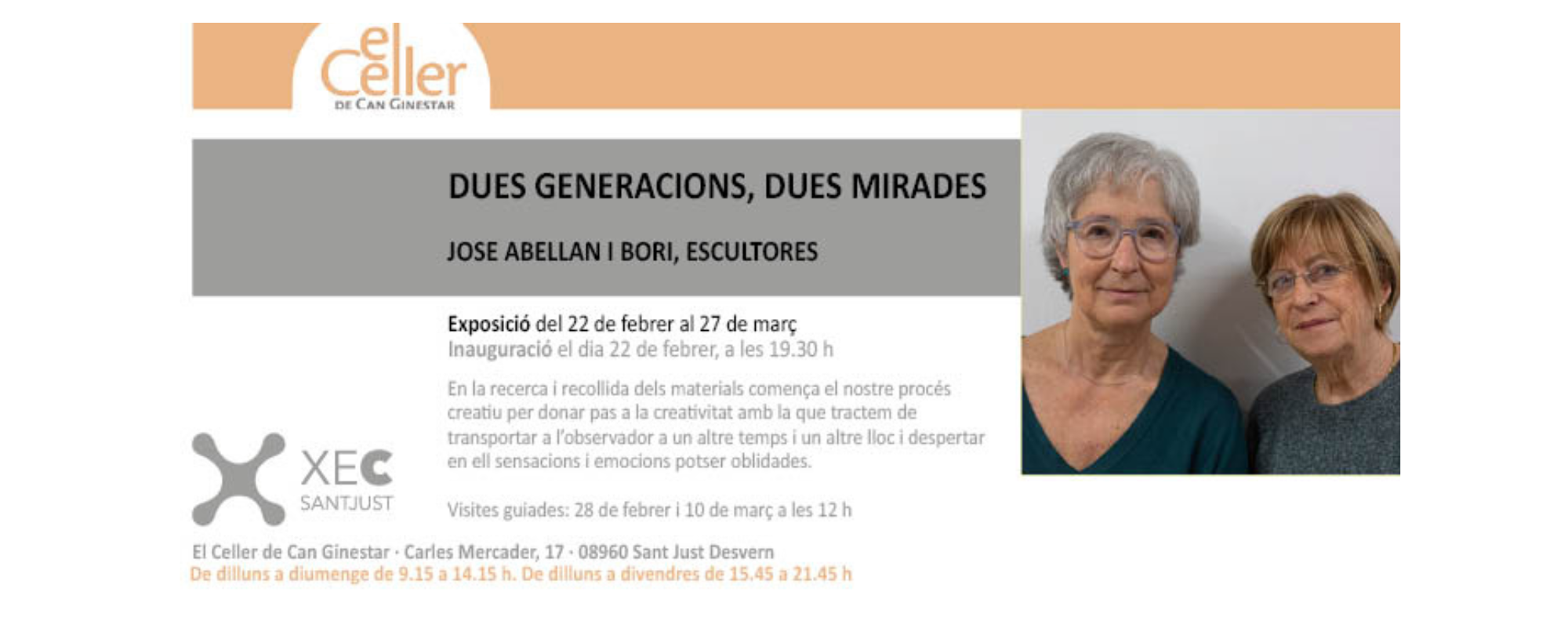 El 22 de febrer s’inaugura l’exposició “Dues generacions, dues mirades” amb escultures de les artistes i veïnes de Sant Just. Per mitjà de les seves obres, la Jose Abellan i la Conxita Bori han unit dues maneres de mirar la bellesa de les escultures. Són dues generacions que veuen dos estils o formes de representar el mateix amb les seves peces. Cadascuna amb el seu estil i la manera de viure l’escultura, però no s’enfronten sinó que es complementen.