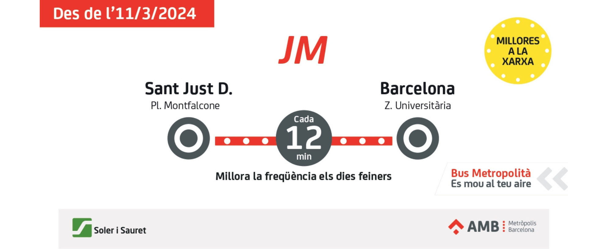 A partir de l’11 de març, l’autobús JM, que connecta Sant Just Desvern amb l’estació de Zona Universitària de Barcelona, millora la freqüència en els dies feines: passarà cada 12 minuts.