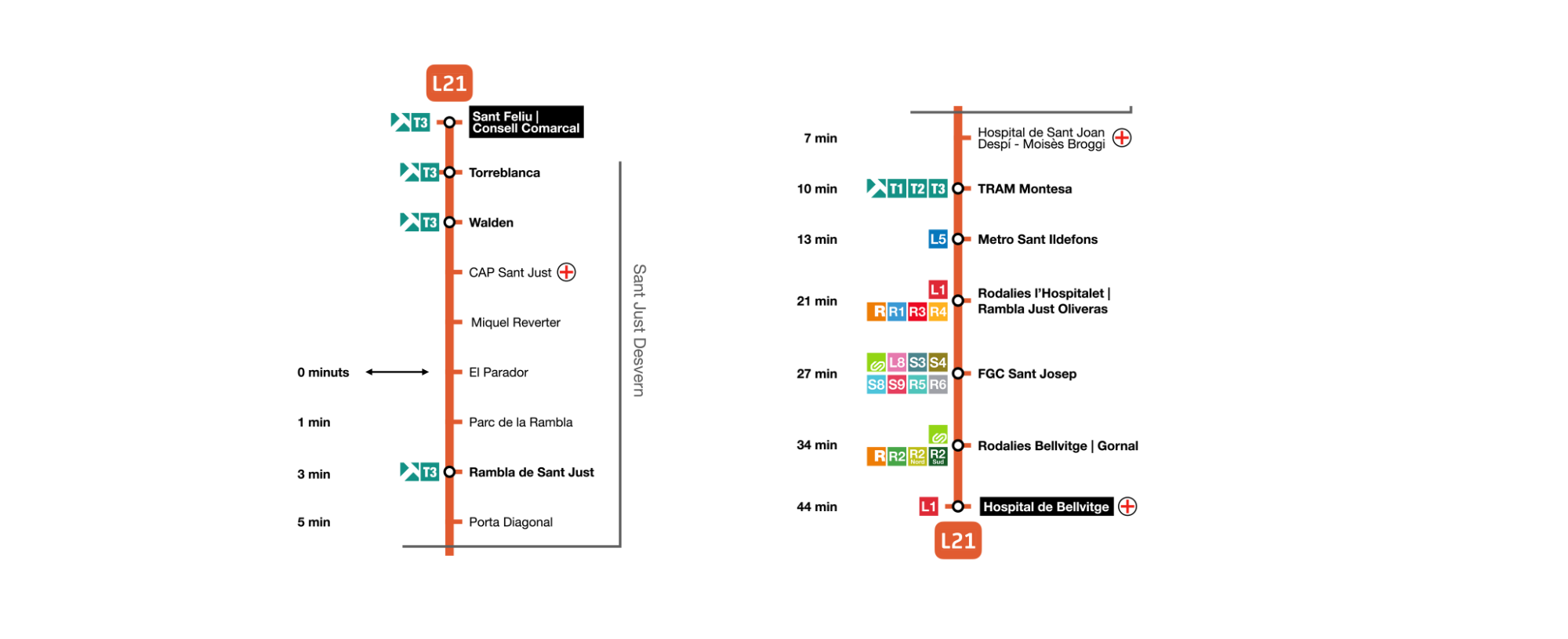 A partir del 6 d’abril, la L21 ens aproparà de forma molt més directa i ràpida a Sant Ildefons (L5 de metro i CUAP), l’estació de Rodalies de l’Hospitalet, els Ferrocarrils de Sant Josep i l’estació de tren de Bellvitge. El recorregut finalitza a l’Hospital de Bellvitge, en 44 minuts.
