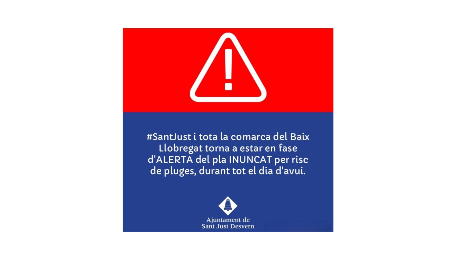L’Ajuntament de Sant Just Desvern ha decidit suspendre avui, seguint el Pla Municipal d’Emergències, les activitats que es desenvolupin a l’exterior, tant les de caràcter extraescolar com les que es realitzen habitualment en equipaments municipals, així com les activitats del Complex Esportiu Municipal La Bonaigua, situat en una zona inundable. A més a més, ha decretat el tancament del Parc de Can Freixes i, en cas d’afectació pel vent, es farà el mateix amb el passadís de Can Ginestar i amb l’activitat esportiva del Camp de Futbol Municipal, que no suspèn a hores d’ara la seva previsió habitual d’entrenaments.