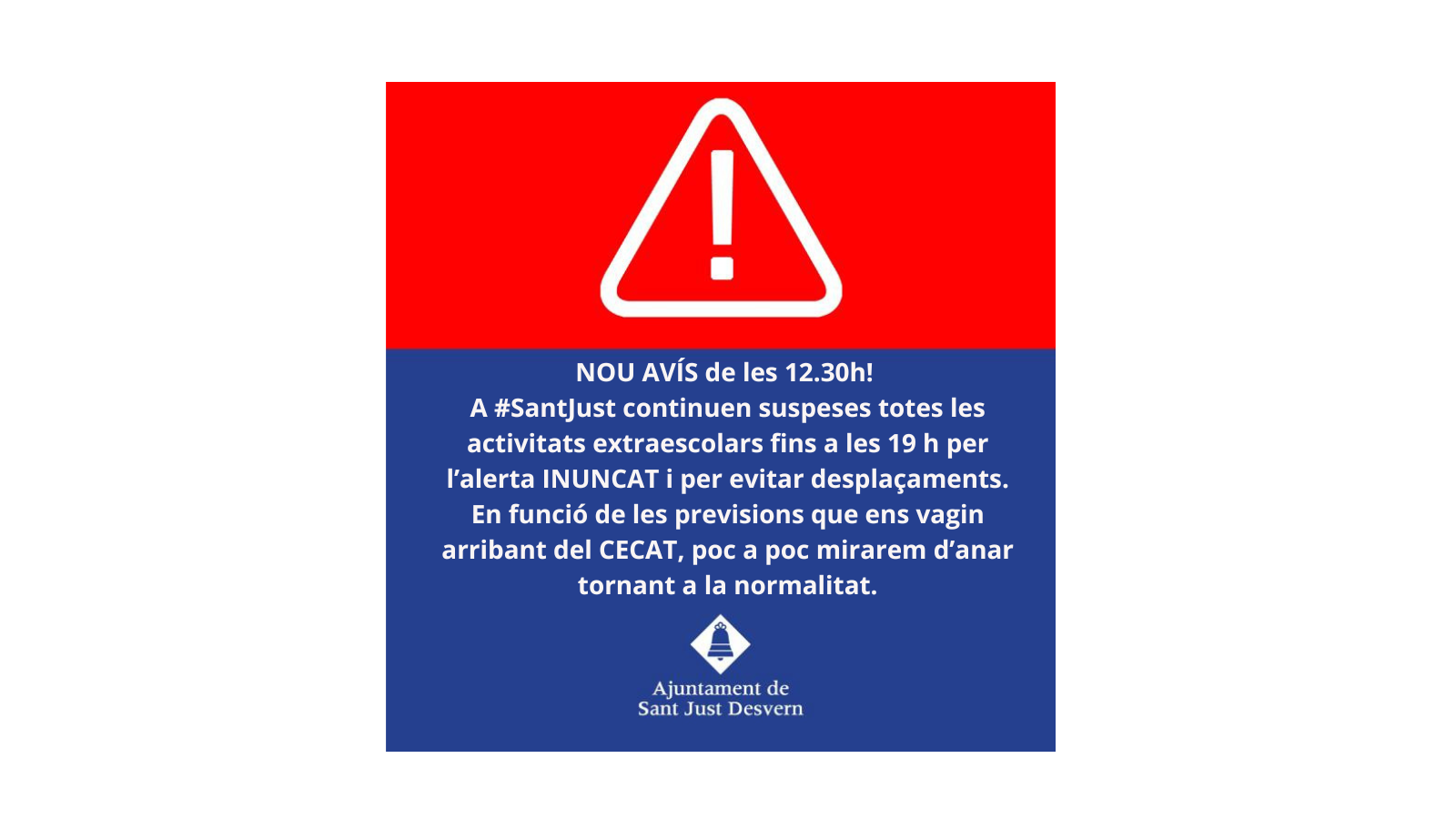 Davant de l’actual situació d’alerta del Pla INUNCAT i per evitar desplaçaments, continuen suspeses totes les activitats extraescolars fins a les 19 h. En funció de les previsions que ens vagin arribant del CECAT, poc a poc mirarem d’anar tornant a la normalitat.