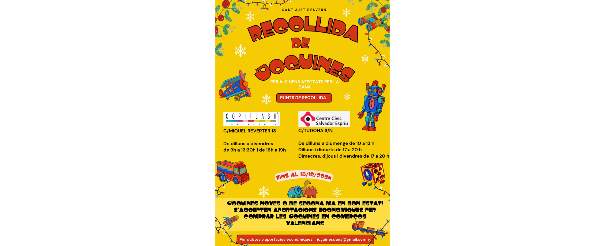 Ciutadans i ciutadanes de Sant Just Desvern impulsen una campanya de recollida de joguines, noves o de segona mà en bon estat, que es destinaran als infants afectats per la DANA dels pobles valencians de Catarroja i d’Utiel. Tot i no ser una associació aquest veïns i veïnes del municipi s’han organitzat per fer arribar aquest material i han organitzat aquesta campanya de joguines que tindrà lloc entre el 25 de novembre i el 18 de desembre amb dos punts de recollida: un d’ells, el Centre Cívic Salvador Espriu, al carrer Tudona s/n, de dilluns a diumenge de 10 a 13 h, dilluns i dimarts de 17 a 20 h, i dimecres, dijous i divendres de 17 a 20 h; i l’altre, la Copisteria Copiflash, al carrer de Miquel Reverter 18, de dilluns a divendres de 9 a 13.30 h i de 16 a 19 h.