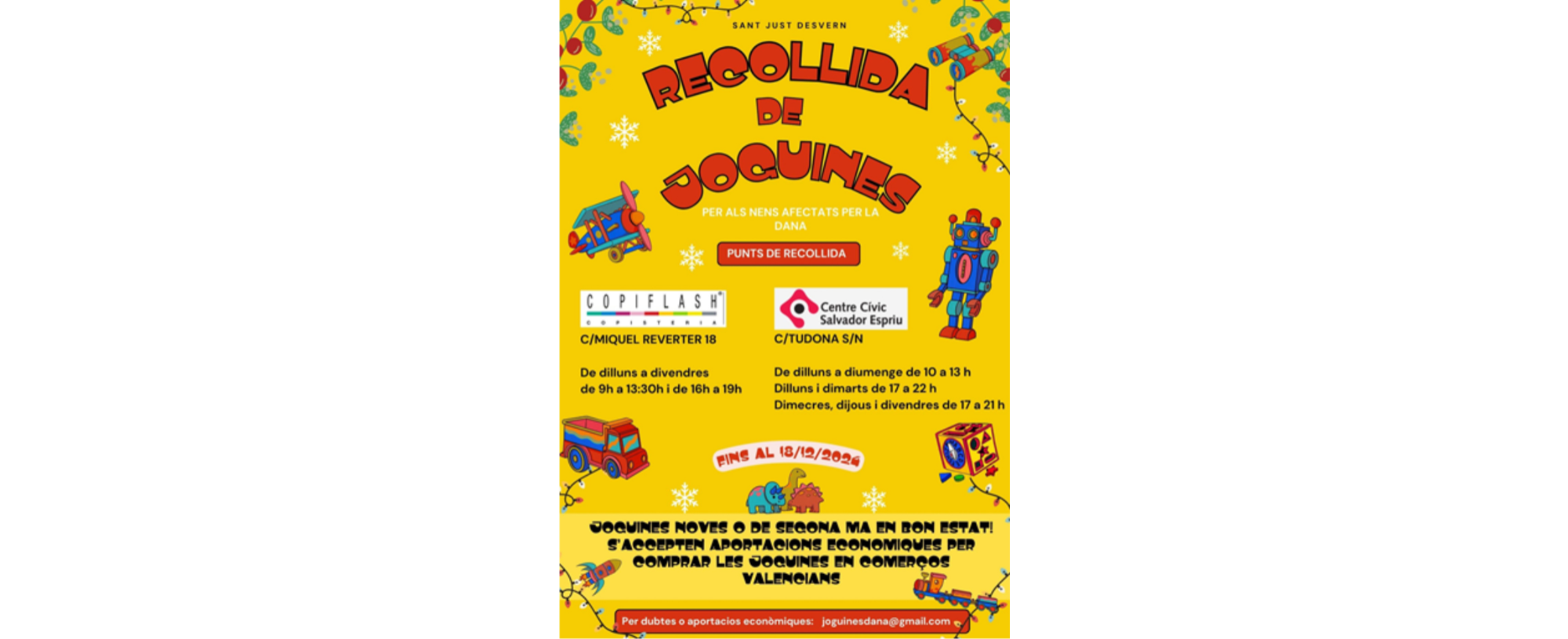 Ciutadans i ciutadanes de Sant Just Desvern impulsen una campanya de recollida de joguines, noves o de segona mà en bon estat, que es destinaran als infants afectats per la DANA dels pobles valencians de Catarroja i d’Utiel.