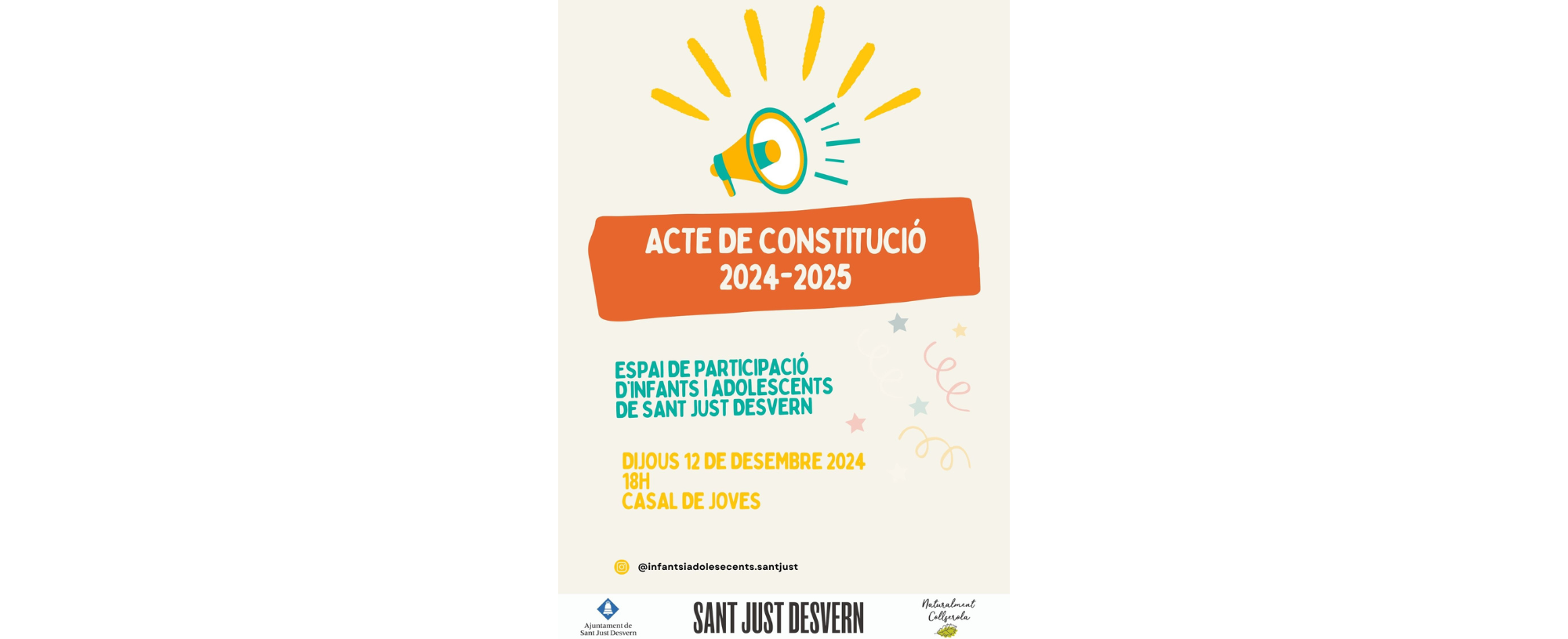 L’Ajuntament de Sant Just Desvern convida a la comunitat educativa, famílies, amics i amigues, tutors i tutores, i persones referents dels centres educatius a l’acte de constitució de l’Espai de Participació d’Infants i Adolescents d’aquest curs 2024-2025, que tindrà lloc el proper dijous 12 de desembre a les 18 h al Casal de Joves.