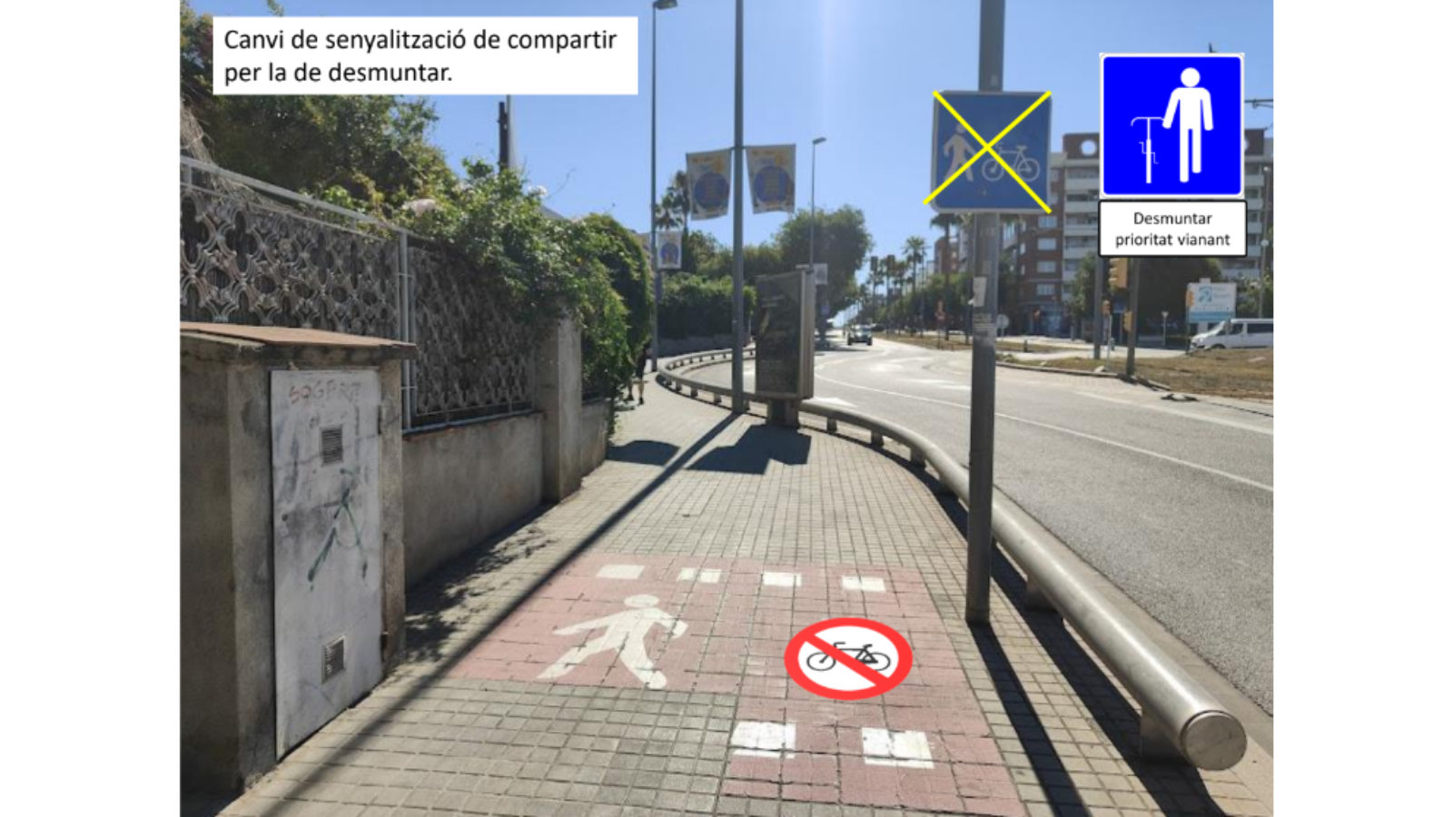 - Ús de senyalització vertical i horitzontal per reforçar la prohibició de circulació perillosa