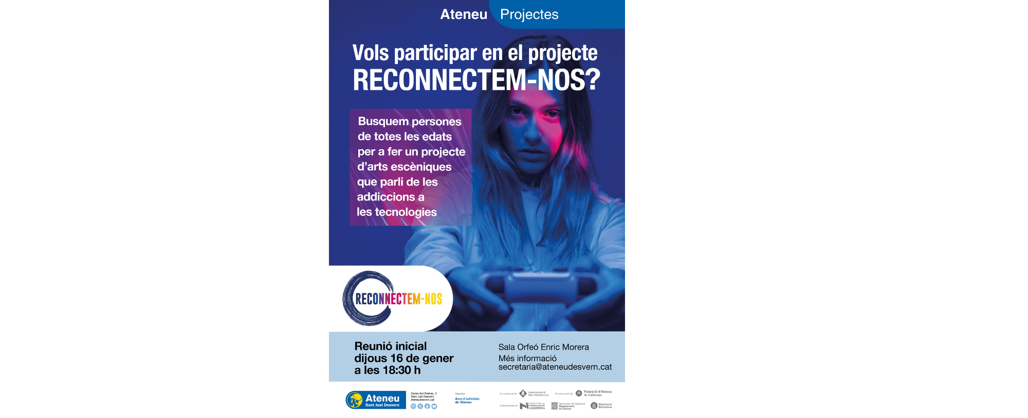 El dijous 16 de gener es posa en marxa el projecte “Reconnectem-nos”, gestionat per la Federació d’Ateneus de Catalunya i la Fundació La Roda, que comptarà enguany amb la participació de l’Ateneu de Sant Just i girarà al voltant de les addiccions a les tecnologies.