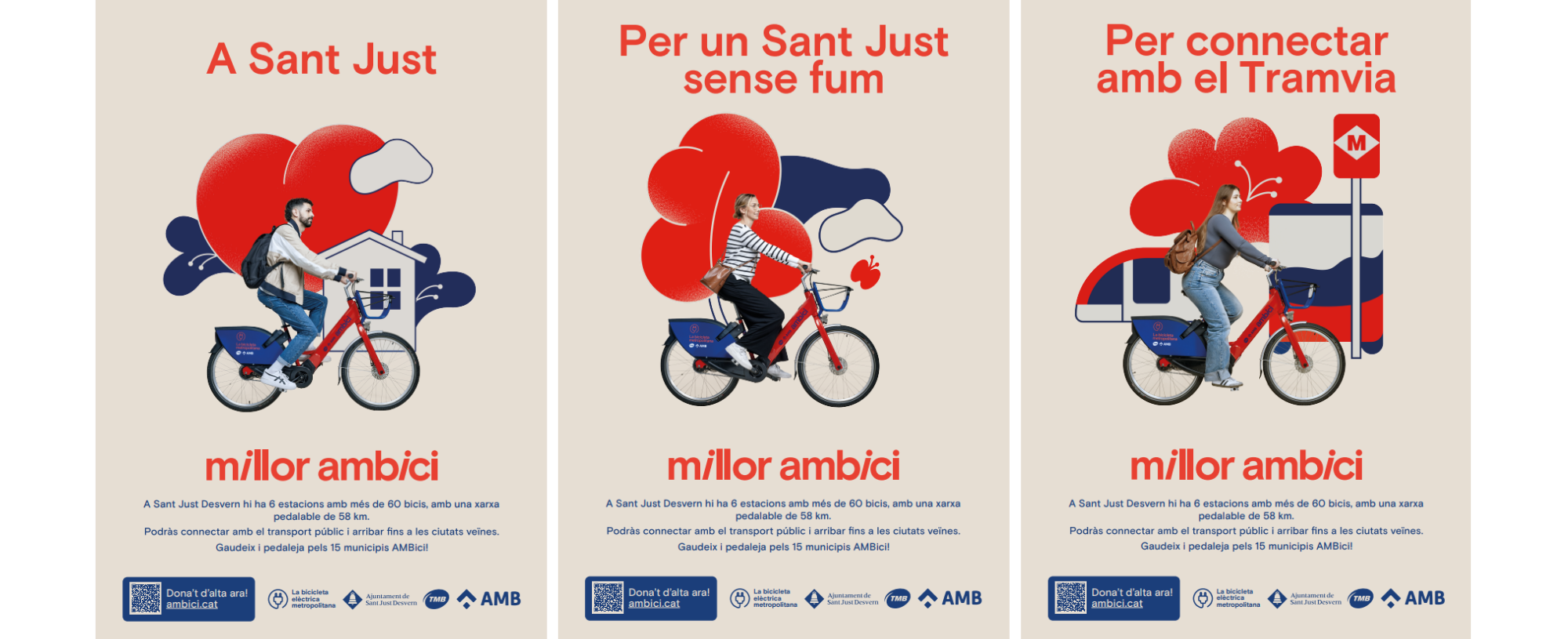 L’AMBici, el servei de bicicleta elèctrica pública impulsat per l’Àrea Metropolitana de Barcelona (AMB) i gestionat per Transport Metropolitans de Barcelona (TMB), que ofereix una alternativa de mobilitat sostenible per moure’s dins de l’àrea metropolitana, impulsa una nova campanya de comunicació per donar a conèixer aquest servei que s’emmarca dins dels esforços per fomentar el transport no contaminant i millorar la connectivitat entre els diferents municipis de l’AMB, com és el cas de Sant Just Desvern.