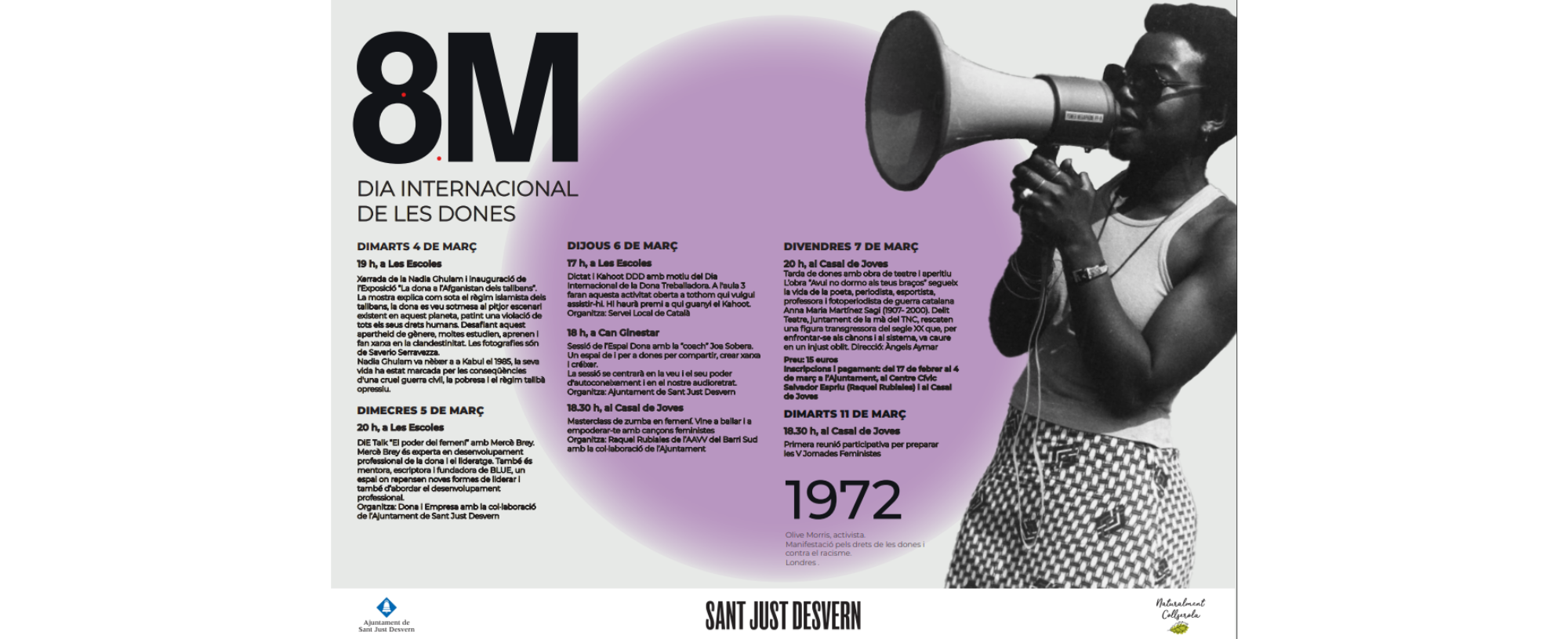 Aquesta és una de les propostes del programa del Dia de la Dona 2025 a Sant Just Desvern, que també inclou dues xerrades: una amb l’activista afganesa Nadia Ghulam i una visita guiada a l’exposició “La dona a l’Afganistan dels talibans”, que mostra com, malgrat les dificultats i l’opressió del règim taliban, moltes dones del país ho arrisquen tot per defensar els drets més bàsics; i una altra amb la Mercè Brey, experta en desenvolupament professional de la dona i el lideratge, i que posarà en valor el poder del femení per repensar noves formes de liderar i abordar el desenvolupament professional.