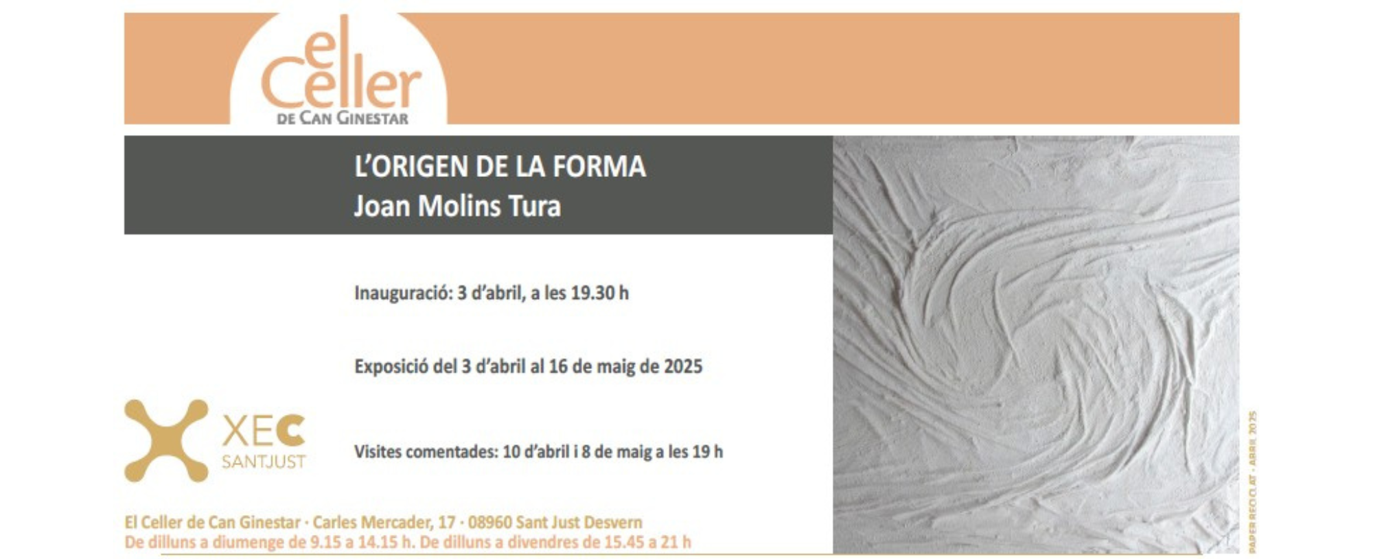Aquest dijous 3 d’abril s’inaugura una nova exposició a la sala El Celler de Can Ginestar. Es tracta d’una mostra d’escultures de Joan Molins Tura que, sota el títol “L’origen de la forma”, presenta una quinzena de peces a mode de retrospectiva i de la seva evolució com a escultor en els darrers deu anys.