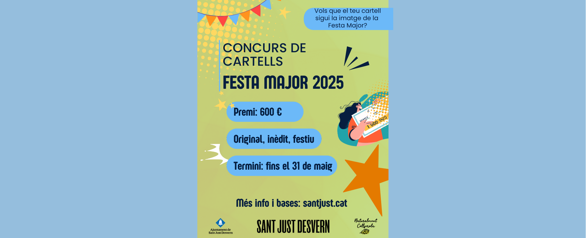 L’Ajuntament de Sant Just Desvern obre una convocatòria per dissenyar el cartell de la Festa Major de Sant Just Desvern d’aquest 2025. Les persones participants en el concurs hauran d’enviar la seva proposta de cartell abans del 31 de maig de 2025, mitjançant el següent formulari.
