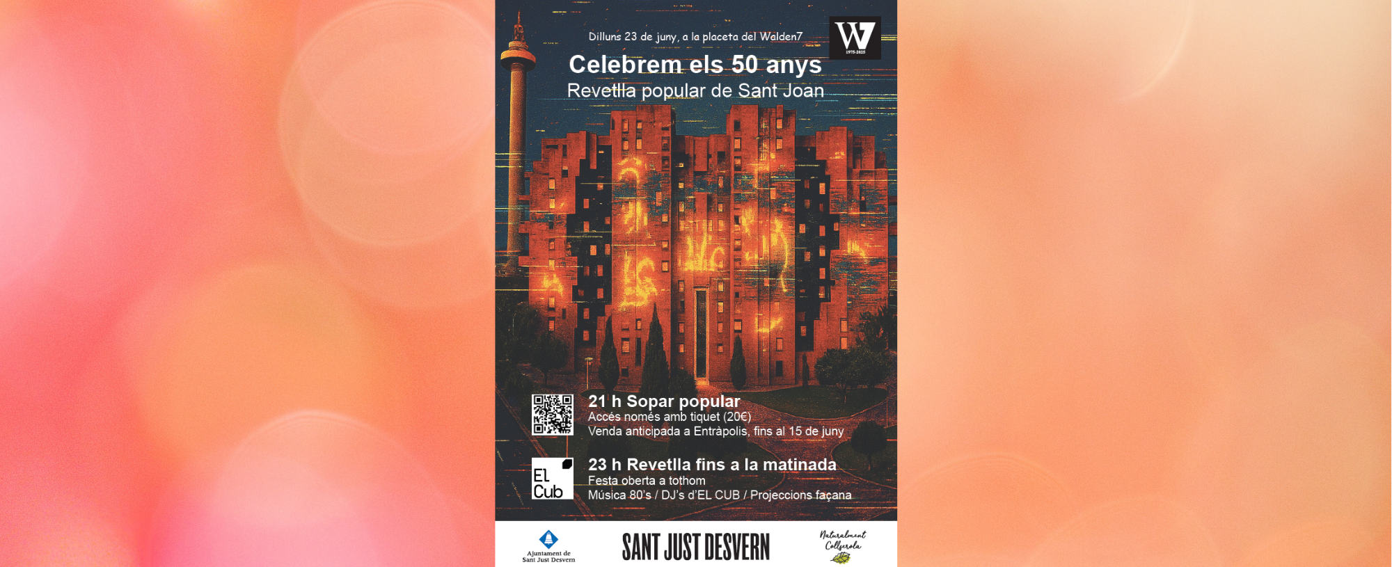 La festa començarà a les 21 h amb un sopar popular, per al qual cal adquirir entrada anticipada (20 €) a través de la plataforma Entràpolis abans del 15 de juny. A partir de les 23 h, la revetlla s’obrirà a tothom amb una gran festa ambientada amb música dels anys 80, a càrrec dels DJ’s de l’entitat local El Cub, i amb projeccions sobre la façana del Walden7.