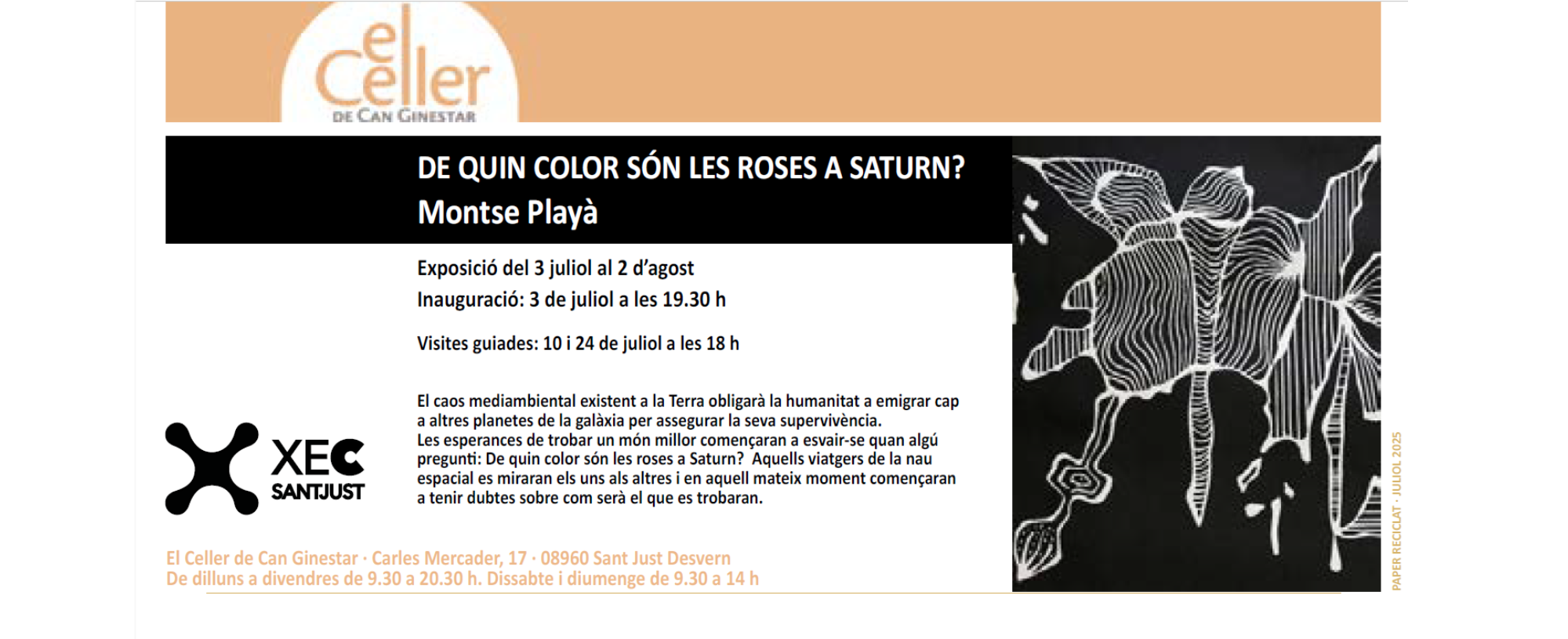 Avui, 3 de juliol, s’inaugura a les 19.30 h l’exposició “De quin color són les roses a saturn?”, un projecte de Montse Playà que inclou tot un seguit de gravats negres realitzats amb linòleum i també en pedra litogràfica, on l’artista representa una natura alienígena, surrealista i intimidant.