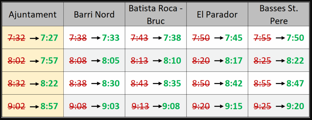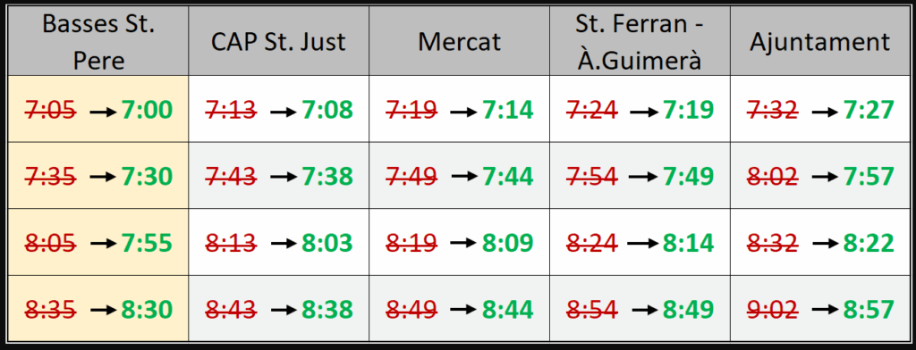 El canvi suposa avançar entre 5 i 10 minuts la sortida des de les terminals, fet que permet garantir l’arribada puntual a les escoles, millorar la fluïdesa del recorregut i oferir un servei més eficient a tota la ciutadania.