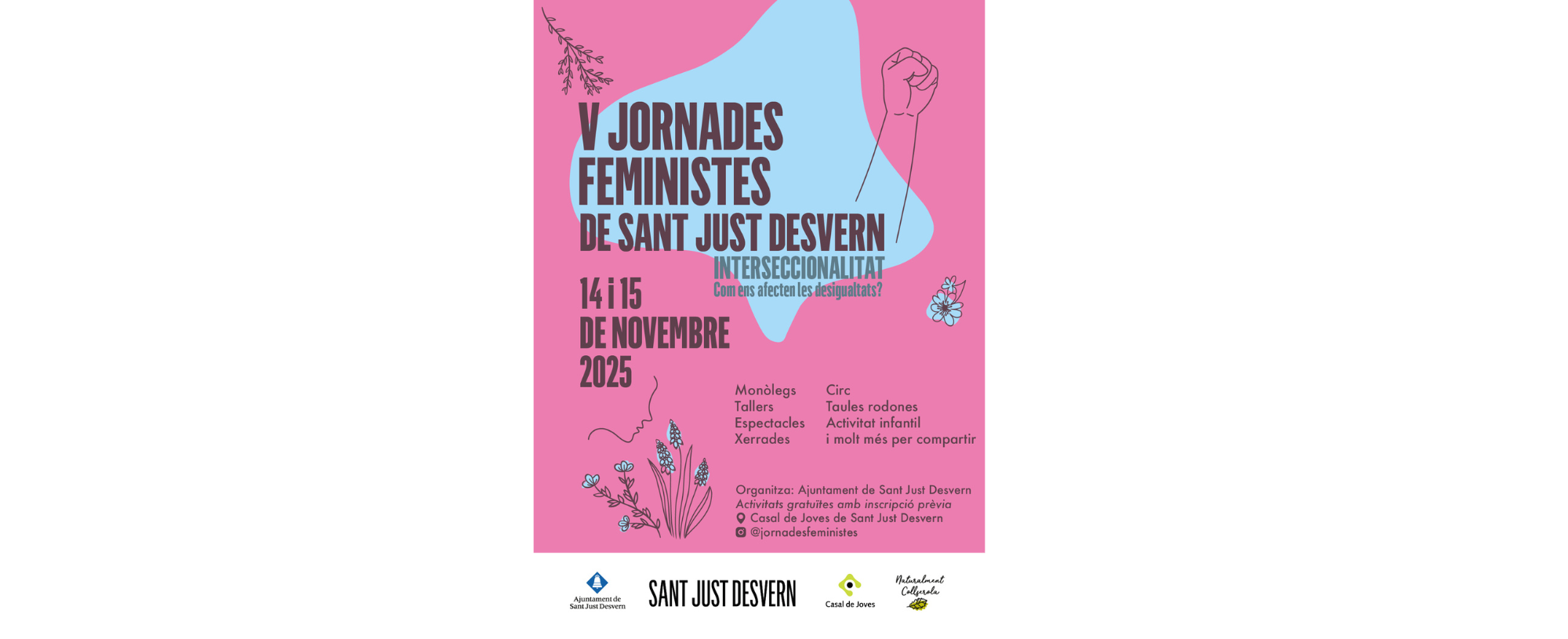 Els dies 14 i 15 de novembre, el Casal de Joves acull la cinquena edició de les Jornades Feministes. Impulsades per l’Ajuntament de Sant Just Desvern i el Casal de Joves, i amb la complicitat i col·laboració d’entitats locals i dones del municipi, aquestes jornades s’han consolidat com un espai de trobada, debat i aprenentatge compartit.