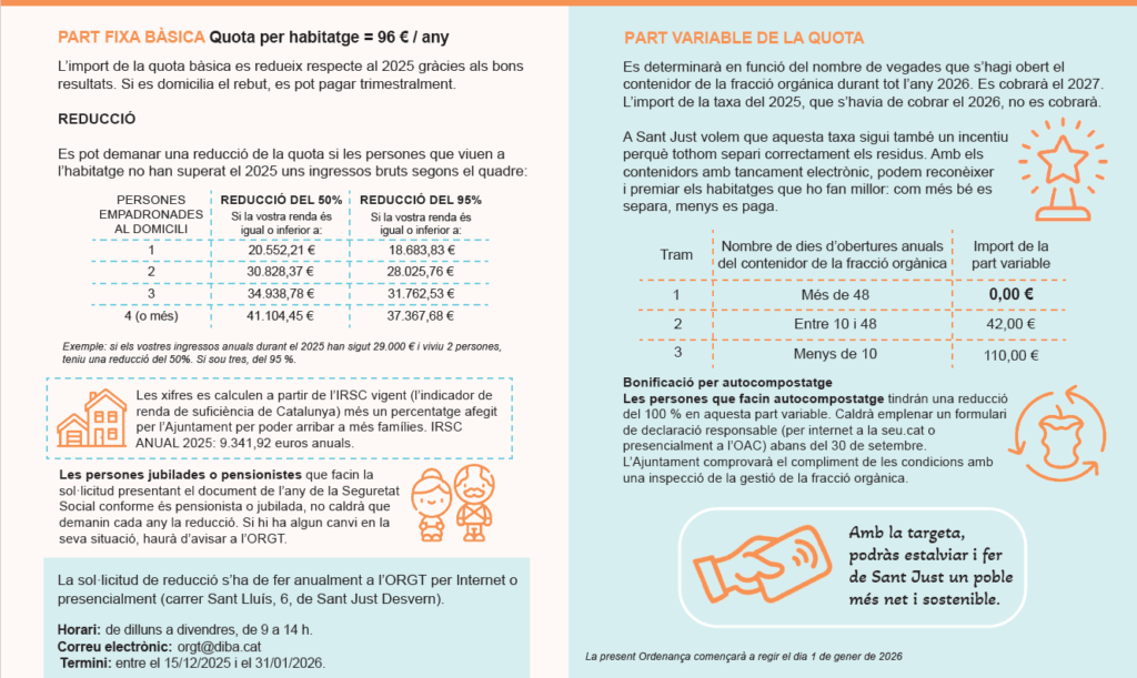 La taxa consta d’una part fixa anual, amb una quota bàsica per habitatge, i d’una part variable, que dependrà de l’ús del contenidor de la fracció orgànica durant tot l’any. Com millor se separin els residus, menor serà l’import de la part variable. Aquesta part es calcularà al llarg del 2026 i es cobrarà el 2027.