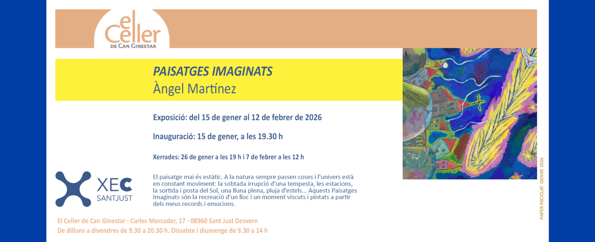 El dijous 15 de gener, a 2/4 de 8 de la tarda, s’inaugura “Paisatges imaginats”, la primera exposició de 2026 al Celler de Can Ginestar. Sota el títol “Paisatges imaginats”, Àngel Martínez mostra a través de diferents obres pictòriques que la naturalesa sempre està en procés de canvi, que el paisatge mai és estàtic.
