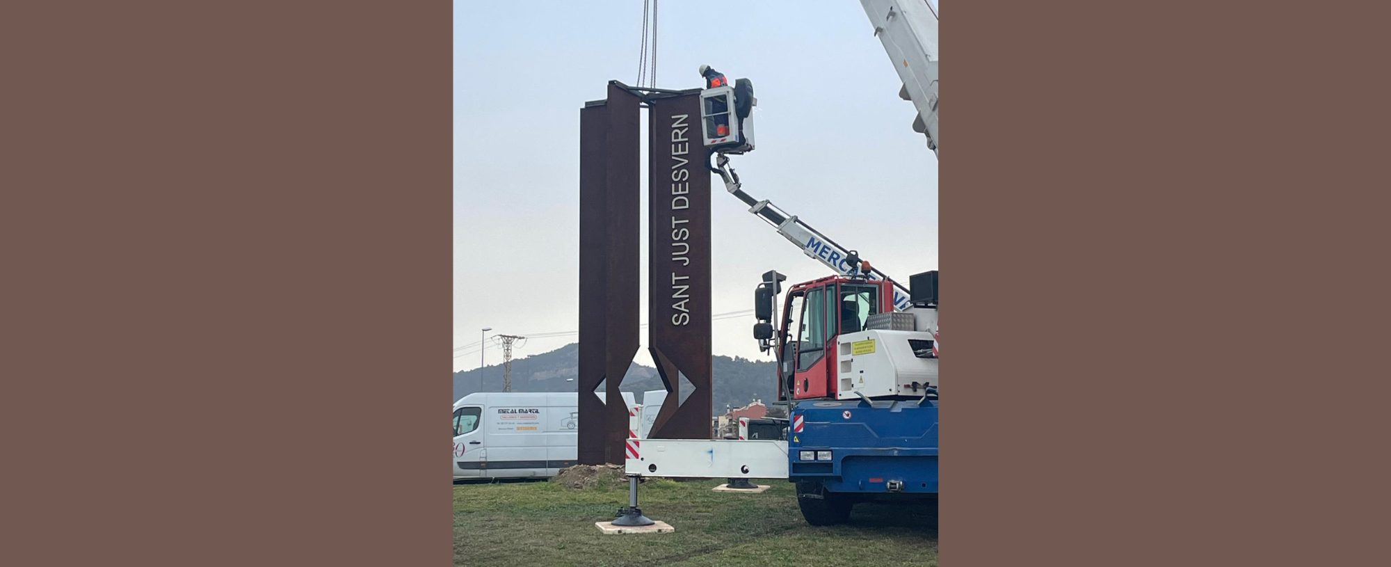 L’escultura està construïda amb xapa corten i representa la campana de l’escut municipal, amb el nom “Sant Just Desvern” visible des de tots els angles. Amb 8 metres d’alçada, esdevé una nova porta d’entrada simbòlica al poble.