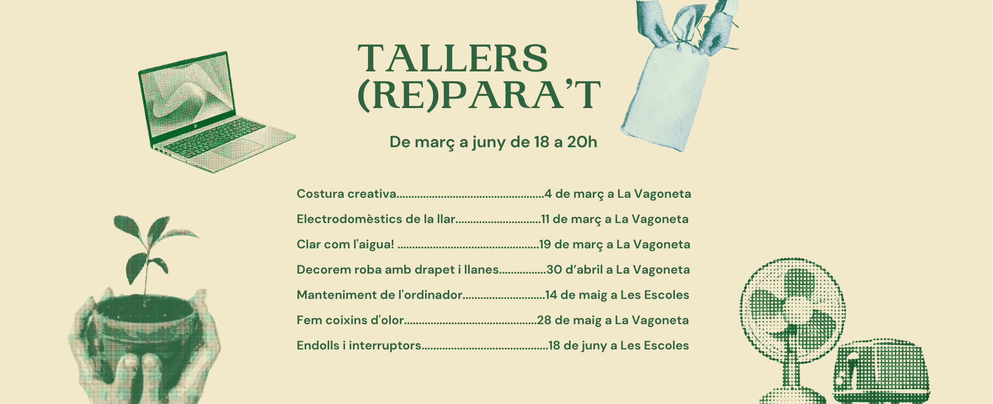 De març a juny, els equipaments municipals acullen una nova edició dels tallers (RE)PARA’T, una proposta gratuïta per aprendre a reparar, reutilitzar i mantenir objectes quotidians. Les sessions es faran de 18 a 20 h i les inscripcions són obligatòries.