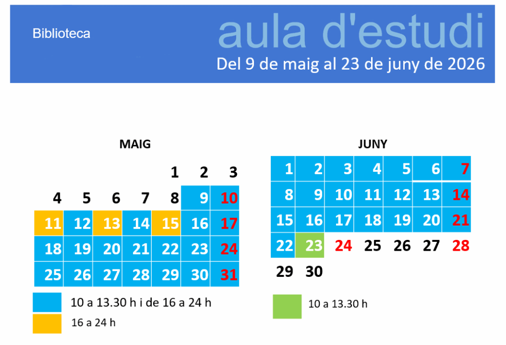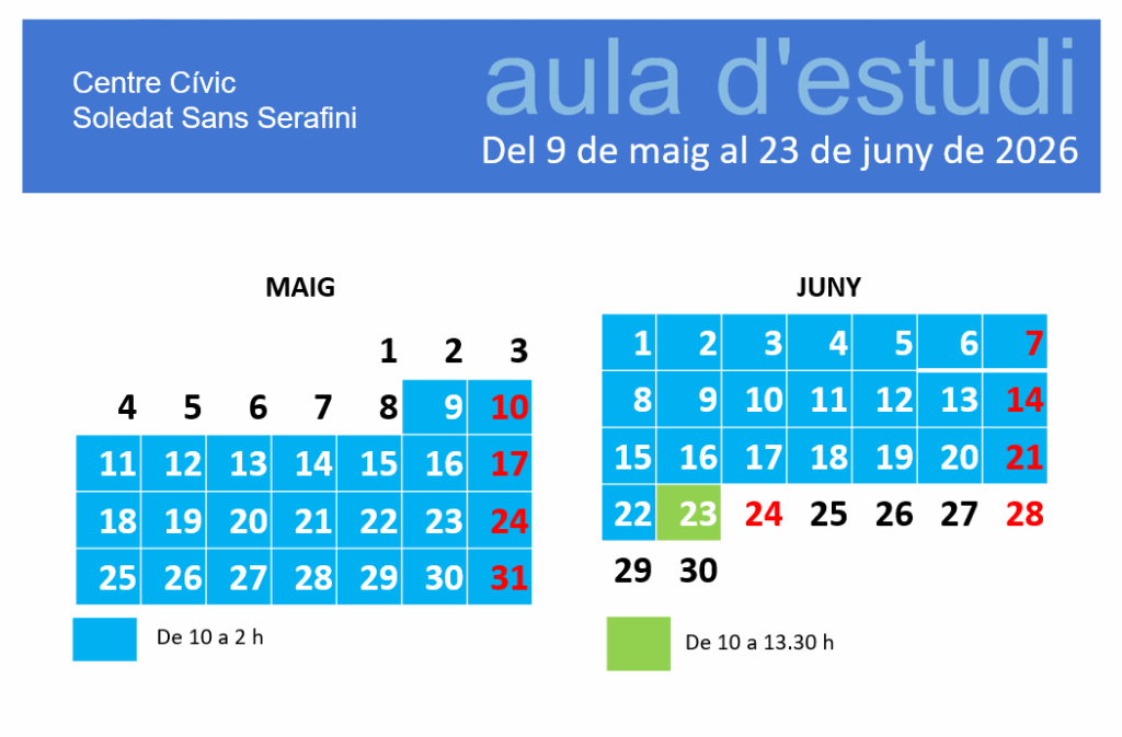 Durant els mesos de maig i juny, amb la temporada d’exàmens, s’amplien els horaris de les aules d’estudi al Centre Cívic Soledat Sans Serafini i a la biblioteca Joan Margarit.